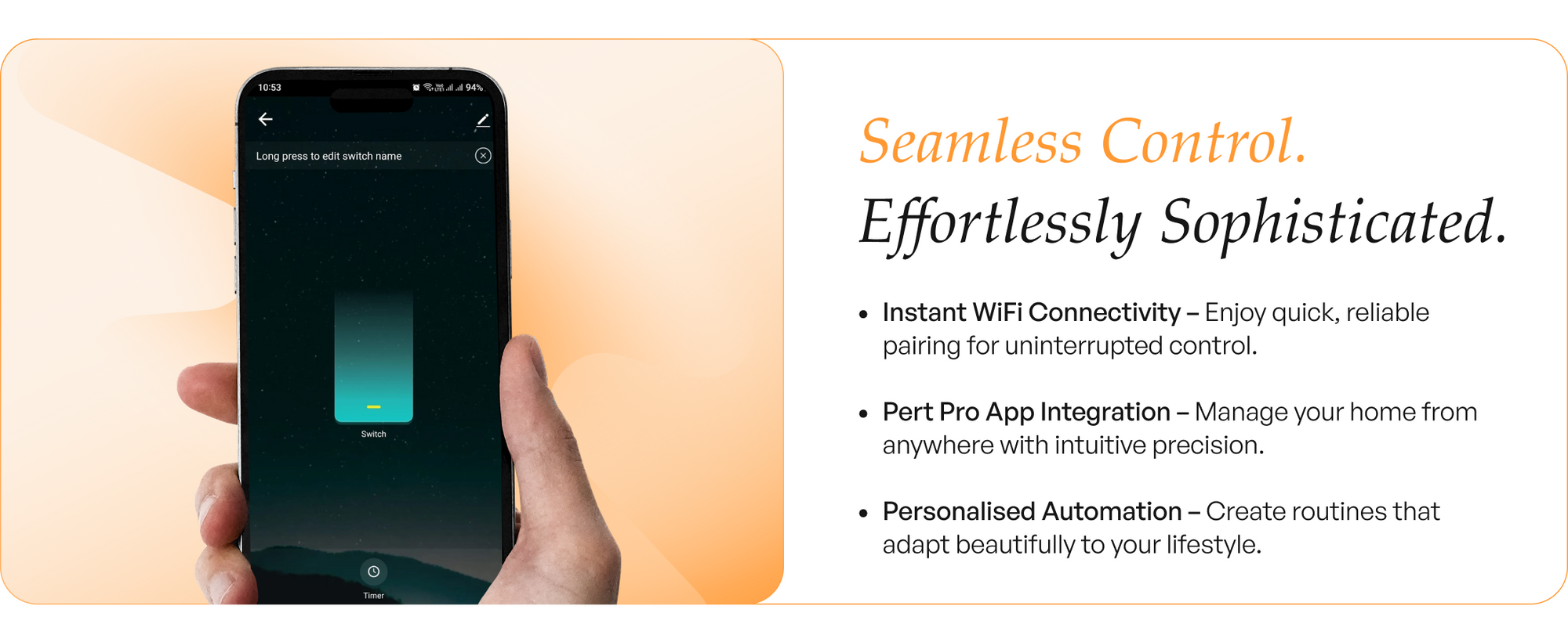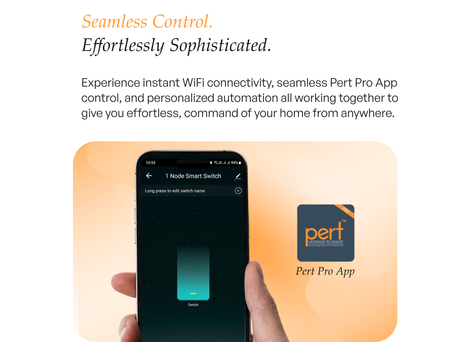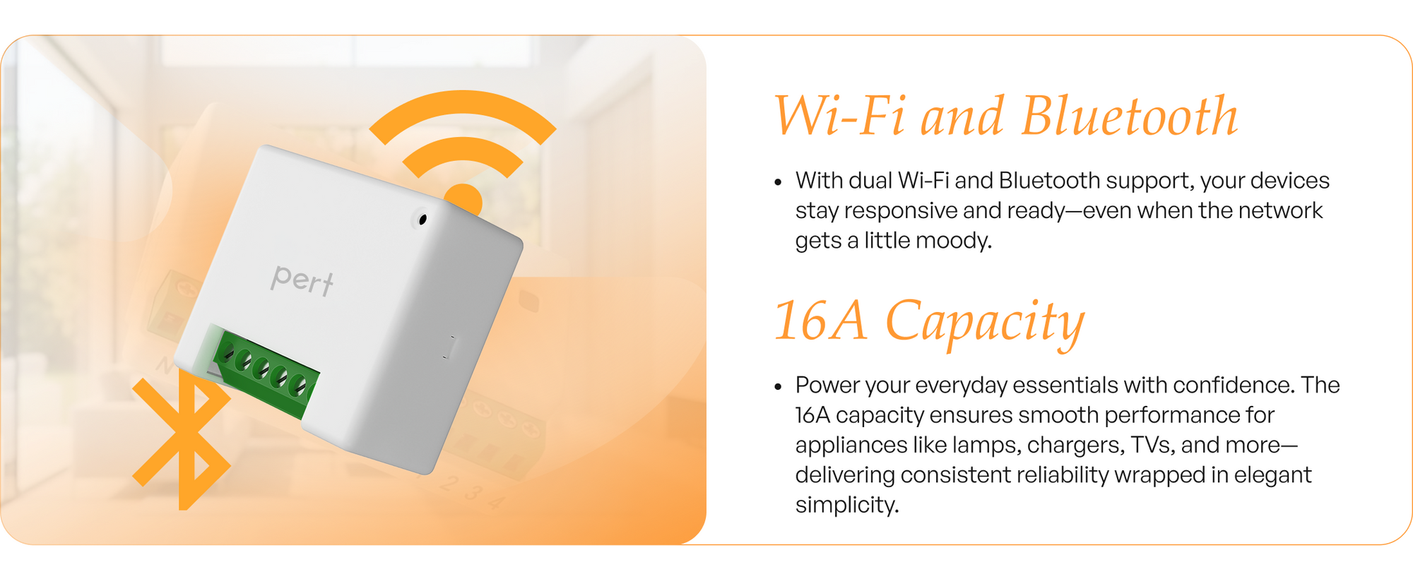 The  1-Node Retrofit Smart Switch transforms your existing switchboard into a smart control hub without changing your existing switches or wall plates. Control up to 1 individual lights or appliances  upto 16amps using your smartphone or voice, with full support for Amazon Alexa and Google Assistant. The compact design installs neatly behind your switchboard, keeping your interiors intact. Manage devices from anywhere using the PertPro app—set schedules, automate routines, or remotely switch devices on/off. Built-in WiFi and Bluetooth ensure reliable connectivity, even during internet outages. Ideal for modern Indian homes, this Made in India smart switch brings energy efficiency, comfort, and convenience with zero rewiring or renovation.